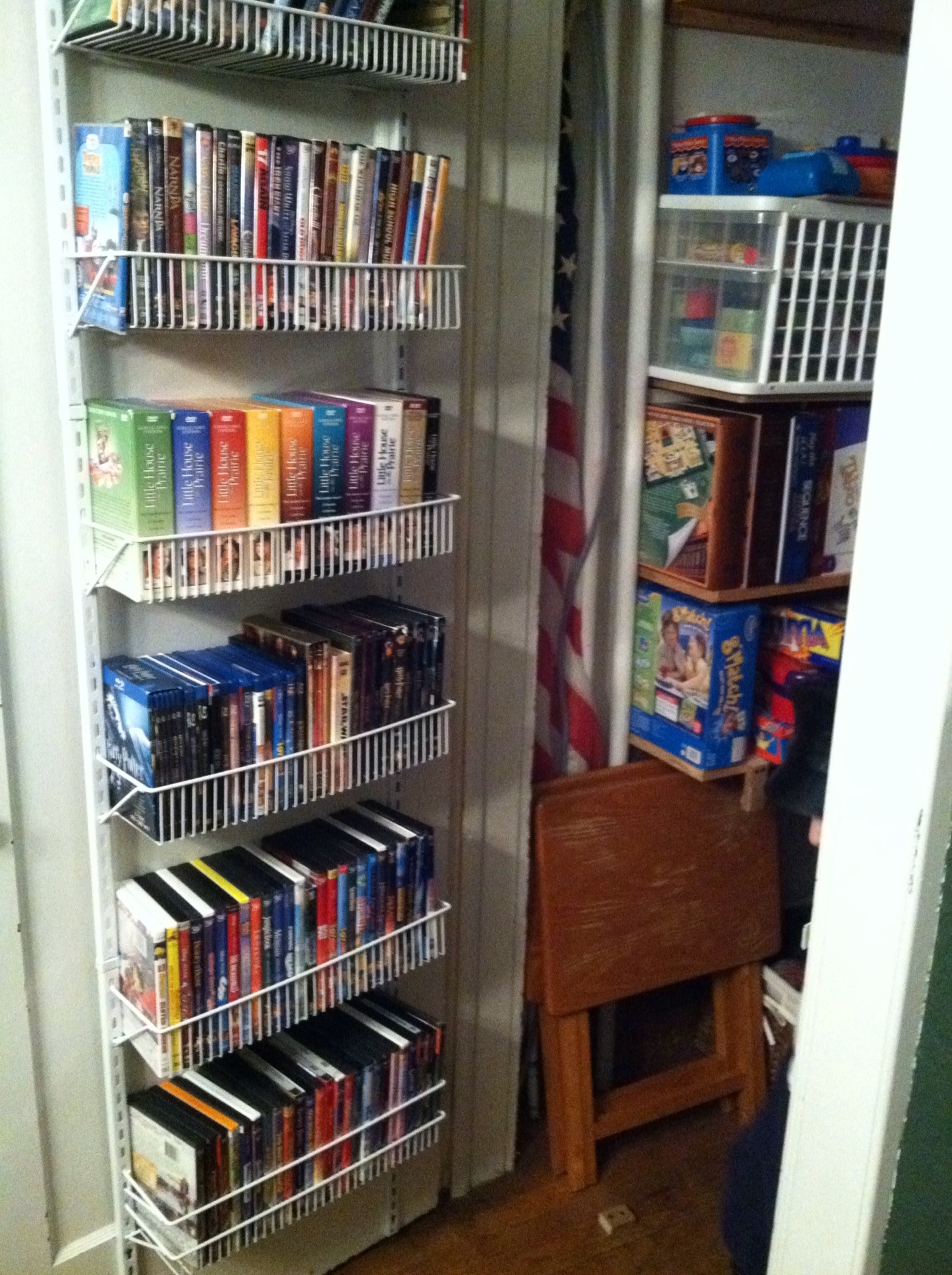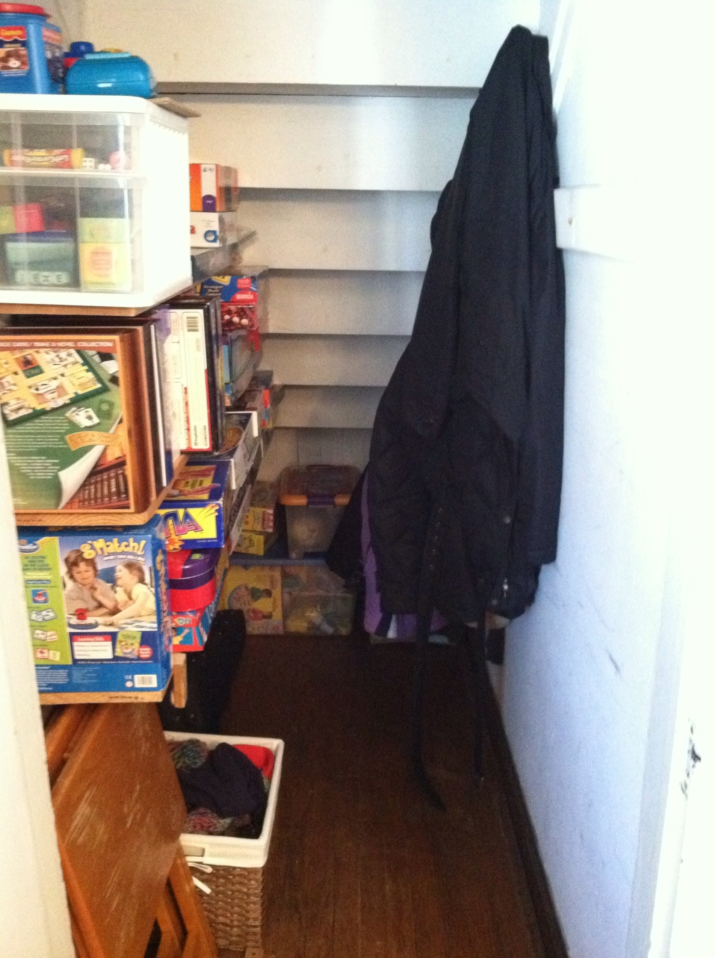 So instead of giving something up, I decided to take something on. I am going through my house, one problem area at a time, and ORGANIZING it!!! And trust me when I say, there are MANY problem areas. Yesterday we tackled the closet under the stairs where we store our games…now it will also hold our coats (which were cluttering up the hooks in the front hall) and all our DVD’s (which were squeezed into a shelf in the bookcase, taking up much needed book space.)