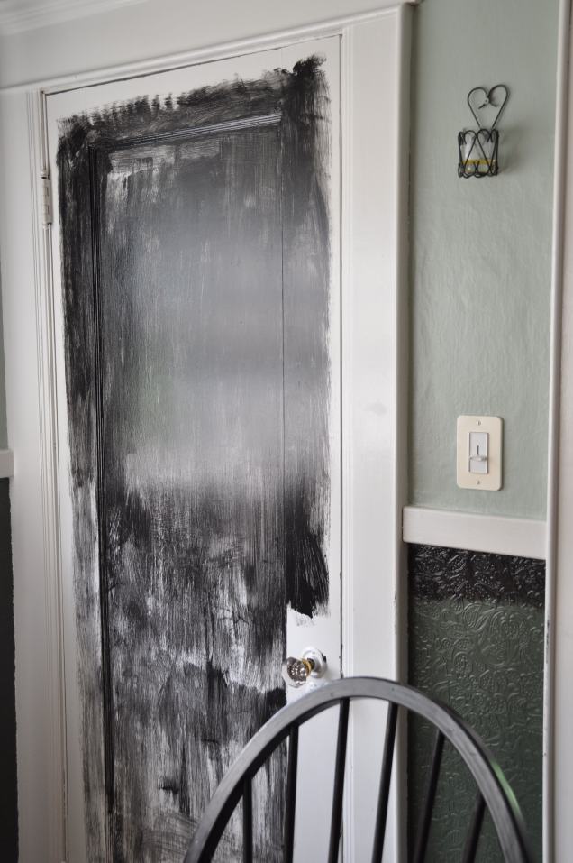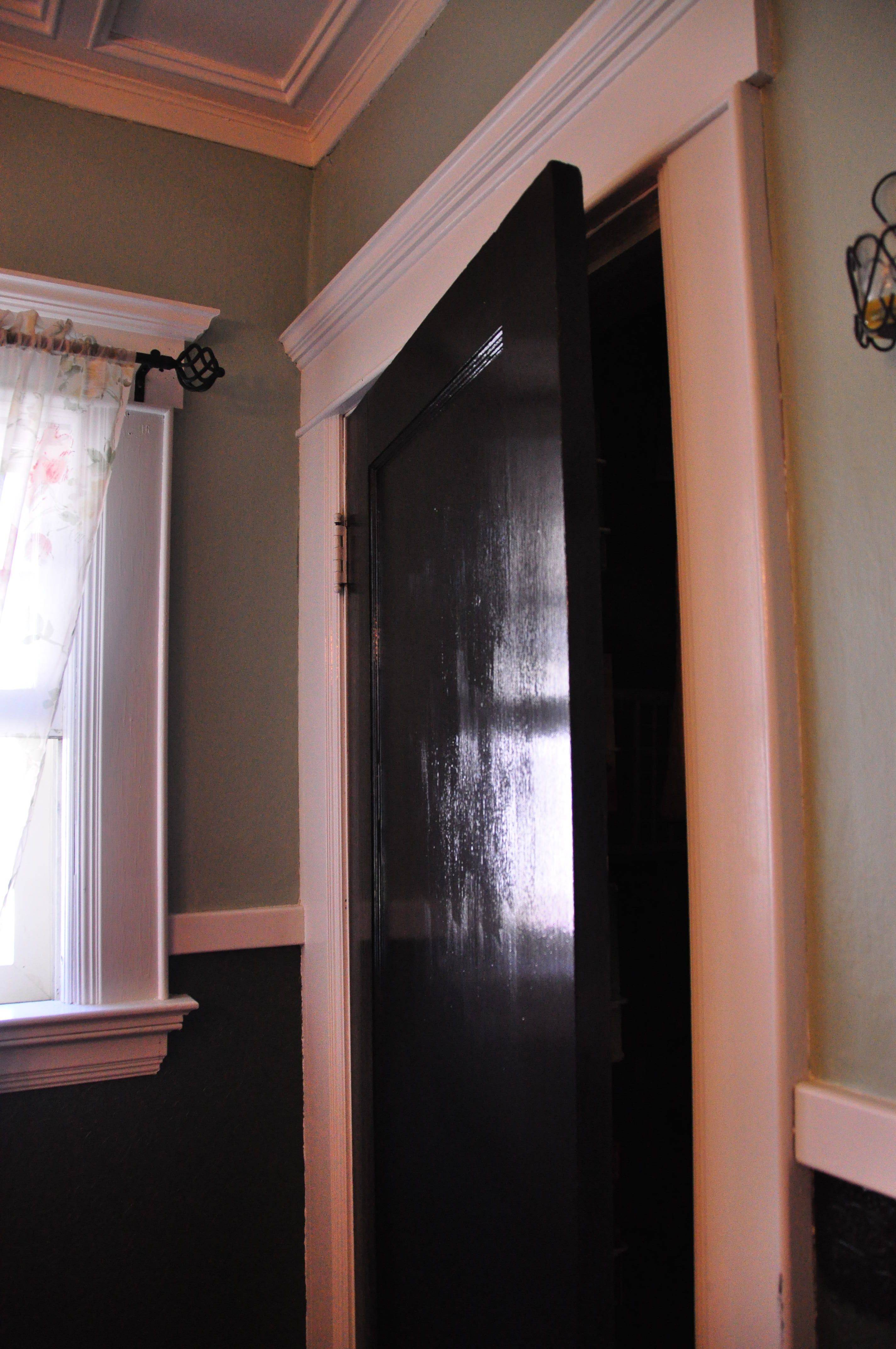 Sadly, the door stayed that way, taunting me for three days until I could stand it no longer.  I figured we’d have to go all the way in order to know whether we liked it or not.  So I got out the black paint and painted three (four?) coats on that poor door, then stood back and gasped.  Just look at it!!!!